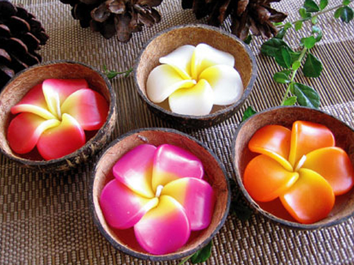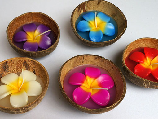 WC-G18 เทียนหอมดอกไม้ในกะลามะพร้าว มีดอกให้เลือกหลากหลายชนิด ทั้งดอกลั่นทม ดอกลีลาวดี ดอกชบา ดอกบัว ใช้ลอยน้ำแทนกระทงหรือใช้จุดเพื่อสร้างบรรยากาศหรือวางประดับตกแต่งบ้าน มีกลิ่นหอมดอกไม้อ่อนๆ นิยมใช้แจกเป็นของขวัญหรือของชำร่วย เหมาะสำหรับซื้อไปใช้เองหรือนำไปขายต่อเพื่อสร้างรายได้ เป็นที่นิยมของนักท่องเที่ยวต่างชาติ